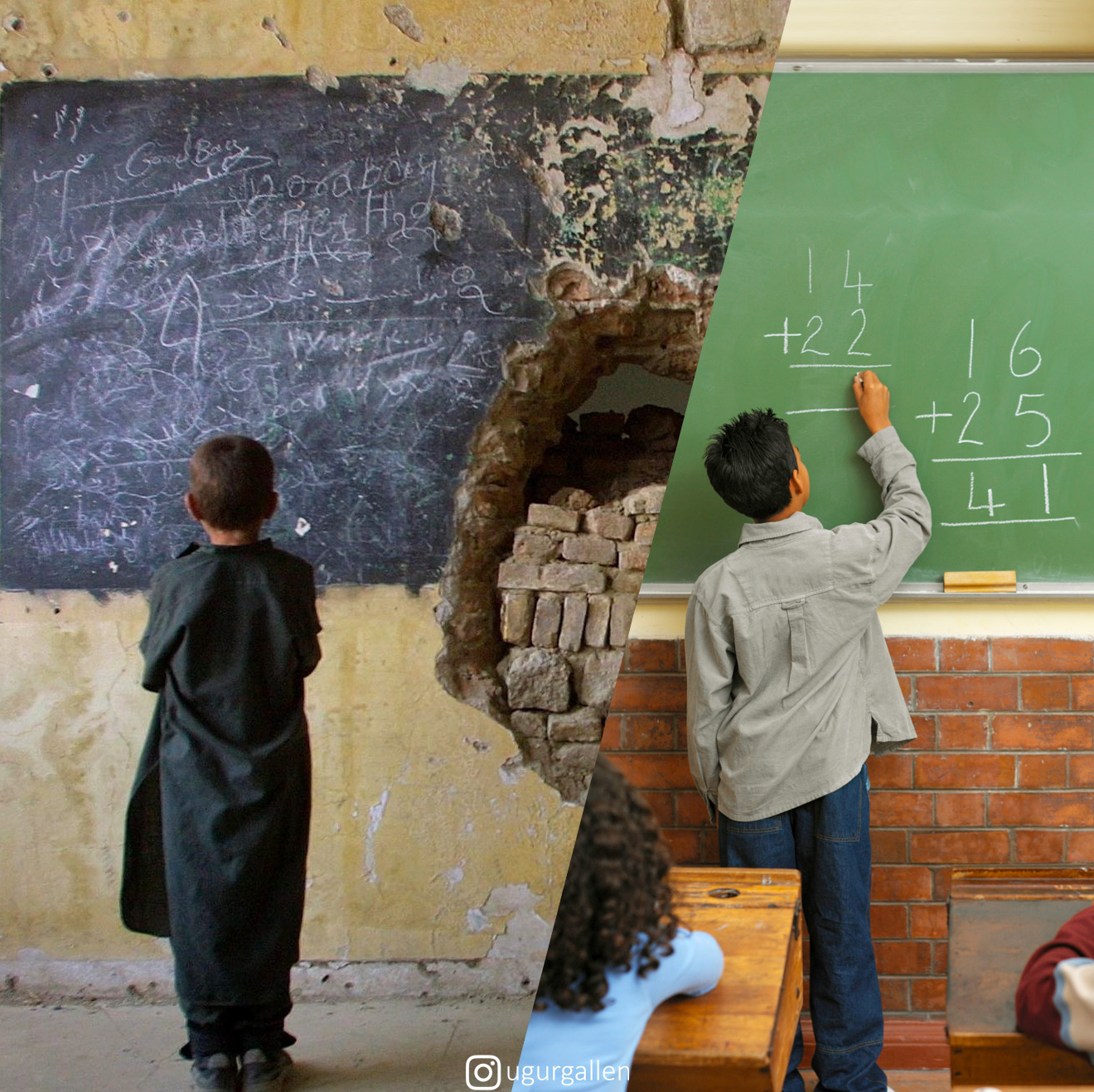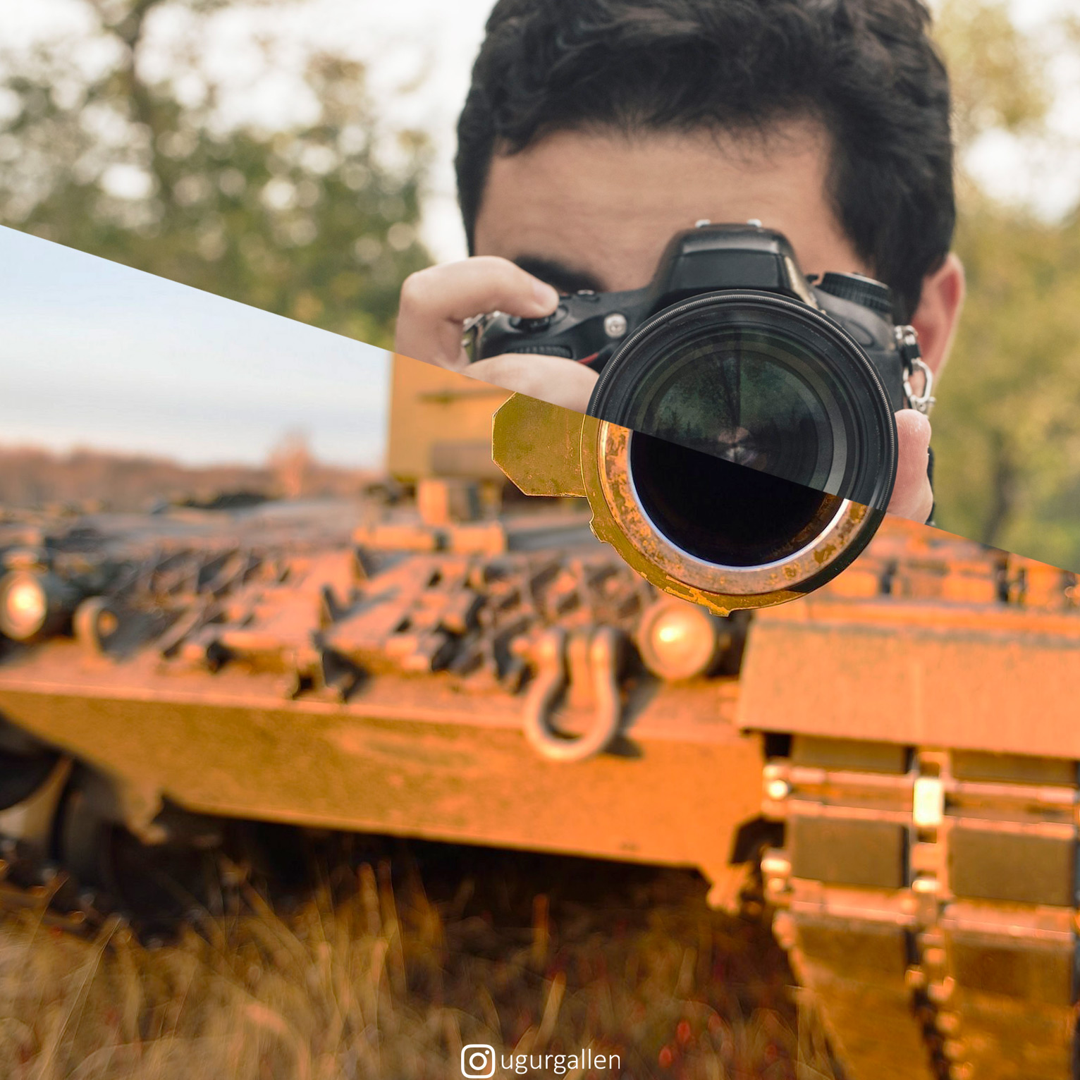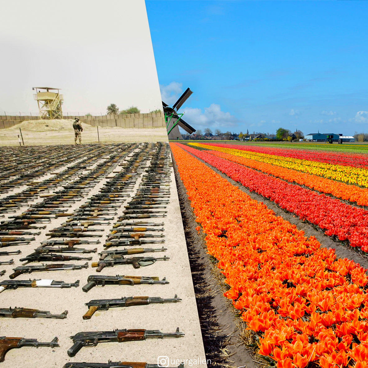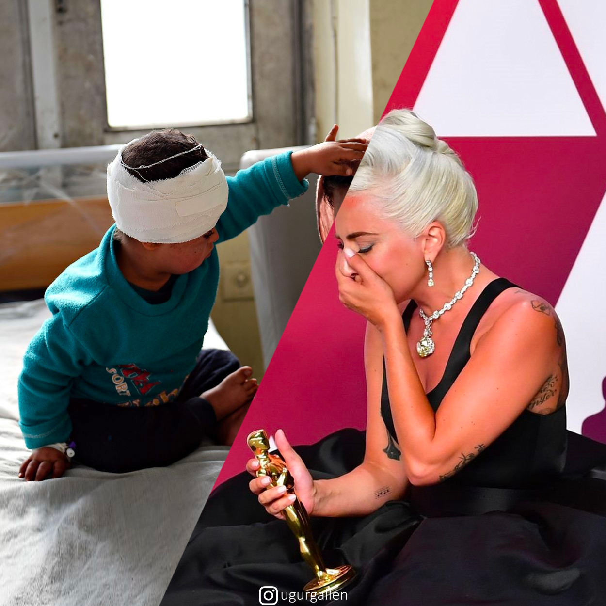 قام الفنان التركي Uğur Gallenkuş باستخدام صورة منقسمة لتأكيد المفارقات المحزنة بين البلدان التي تتعرض للنزاعات والحروب و بين المجتمعات التي تعيش في رخاء و سلام. ركّز Gallenkuş في مقارناته على الثقافة البصرية الغربية مثل الايقونات المسيحية لمريم العذراء وطفلها وعلى صورة الانستغرام لكوز المثلجات.